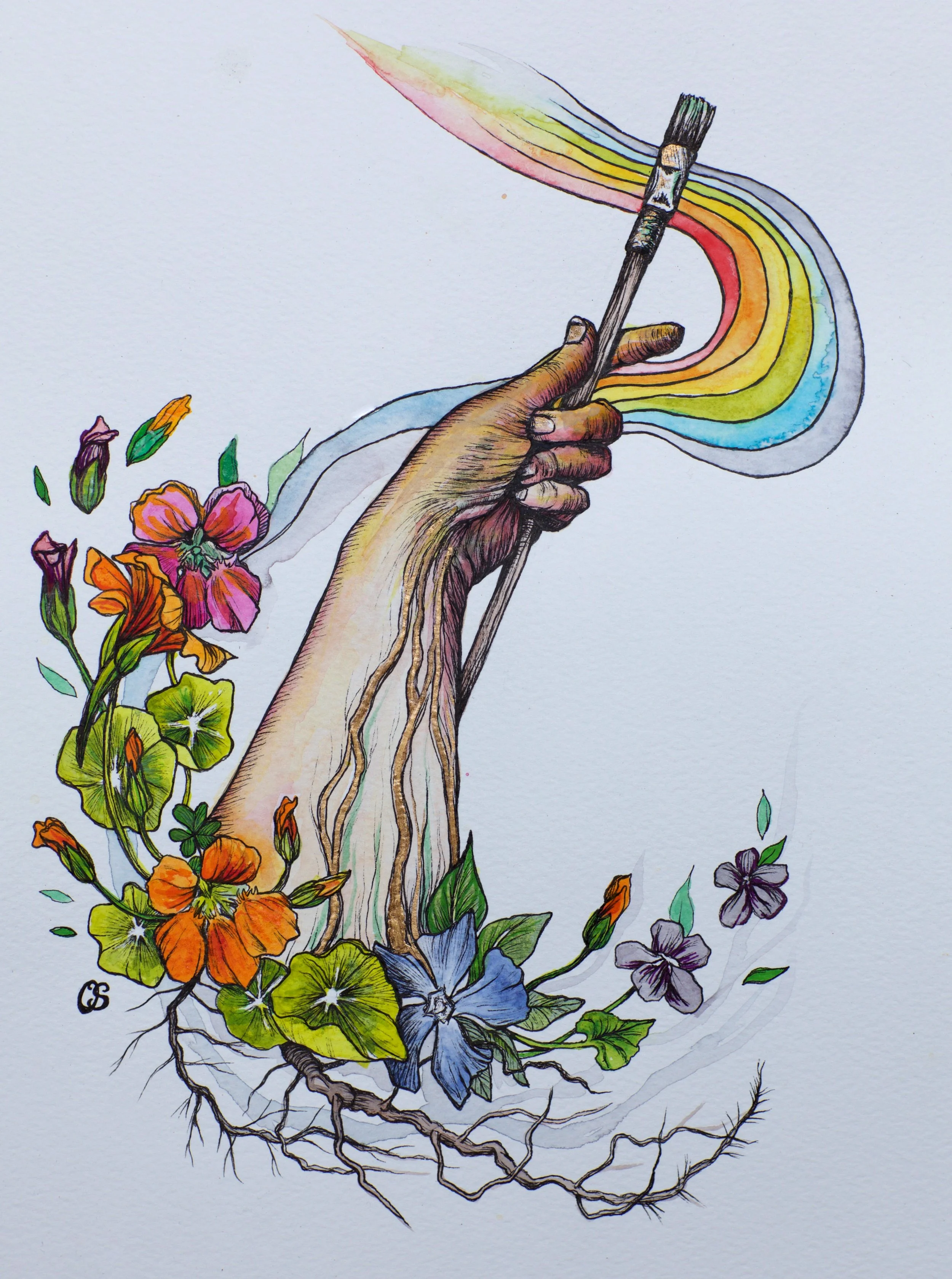 Micron pen, watercolour, coloured pencil, acrylic, on paper.